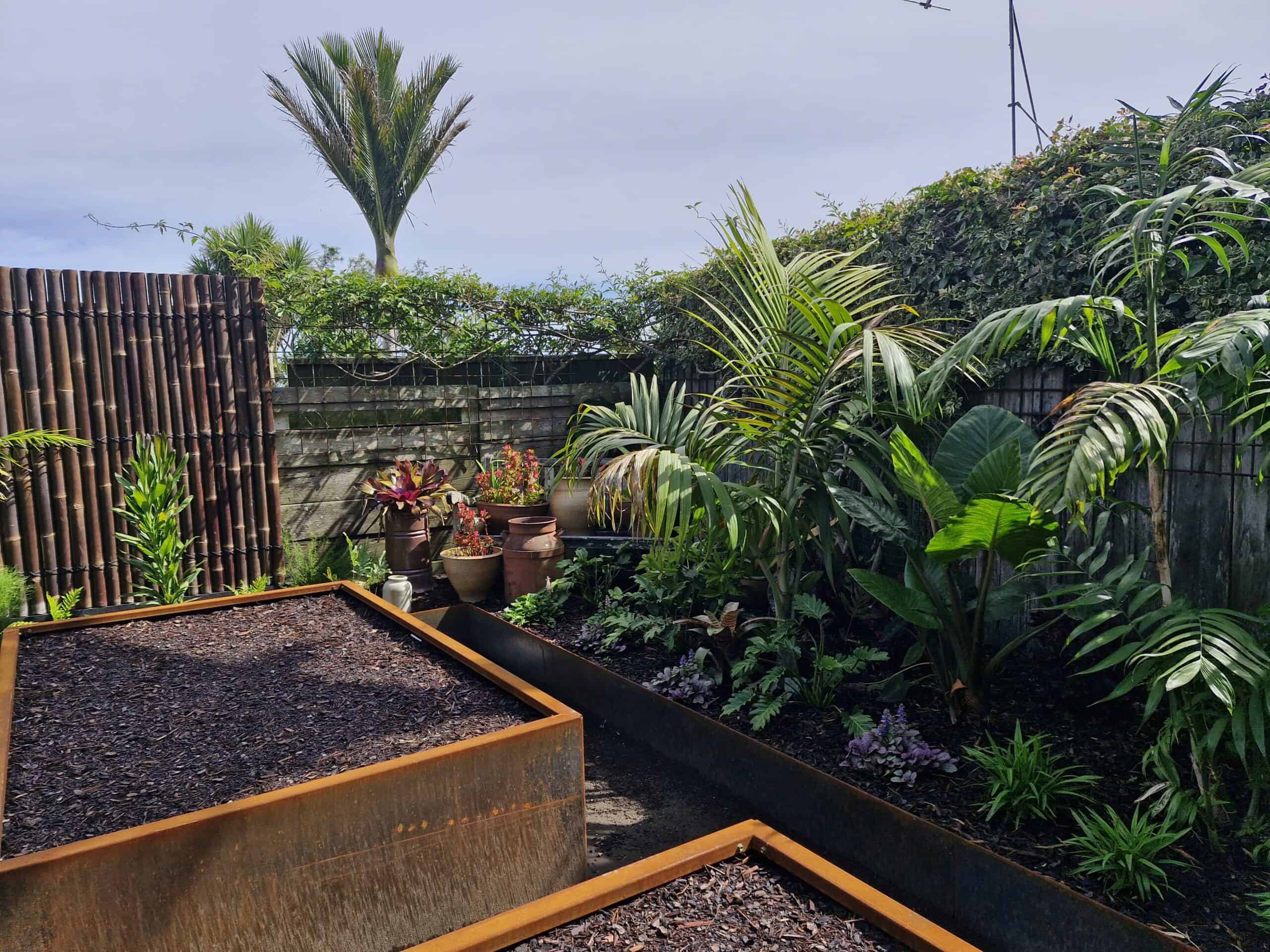 The brief was to enhance the overall aesthetic of the space, conceal the shed and mismatched boundary fencing, create space for a future outdoor shower, and incorporate lush subtropical planting alongside functional vegetable gardens.