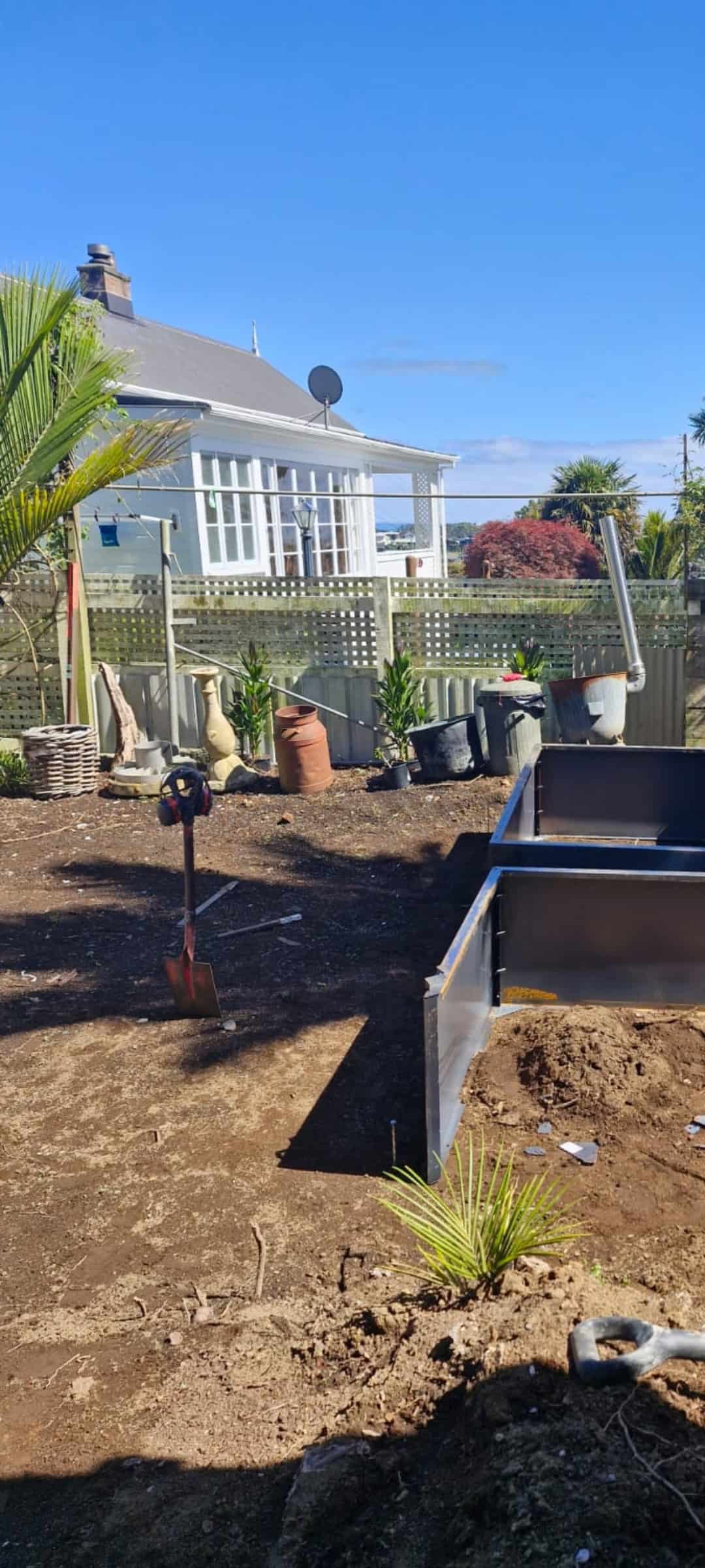 The brief was to enhance the overall aesthetic of the space, conceal the shed and mismatched boundary fencing, create space for a future outdoor shower, and incorporate lush subtropical planting alongside functional vegetable gardens.