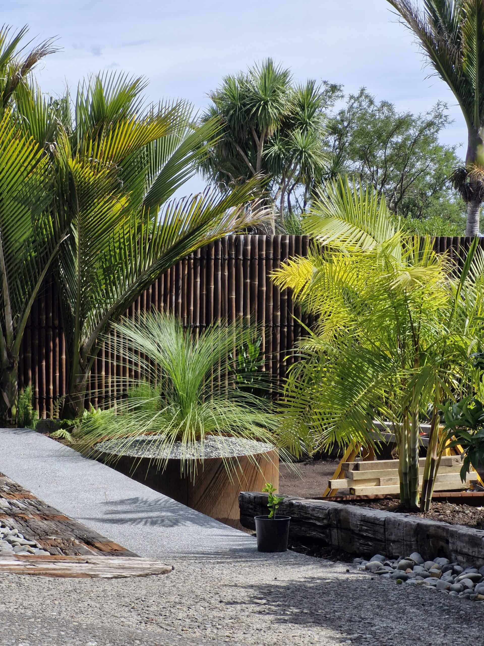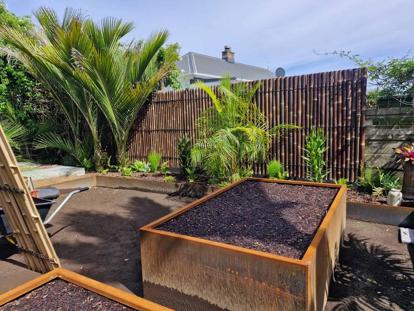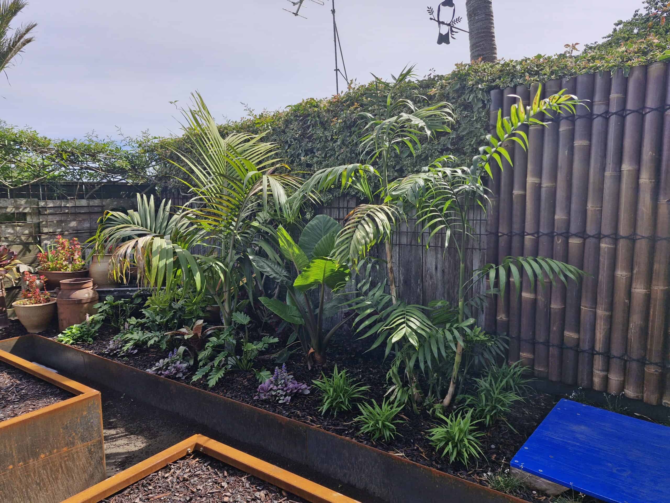 To unify the perimeter, bamboo screening panels were installed to soften and visually simplify the existing fencing. Productive gardening was incorporated through custom raised vegetable boxes constructed along the boundary using Straightcurve garden edging, creating clean architectural lines while maximising planting space. These beds were layered with screening palms and an abundance of ferns to establish privacy and a rich subtropical atmosphere.