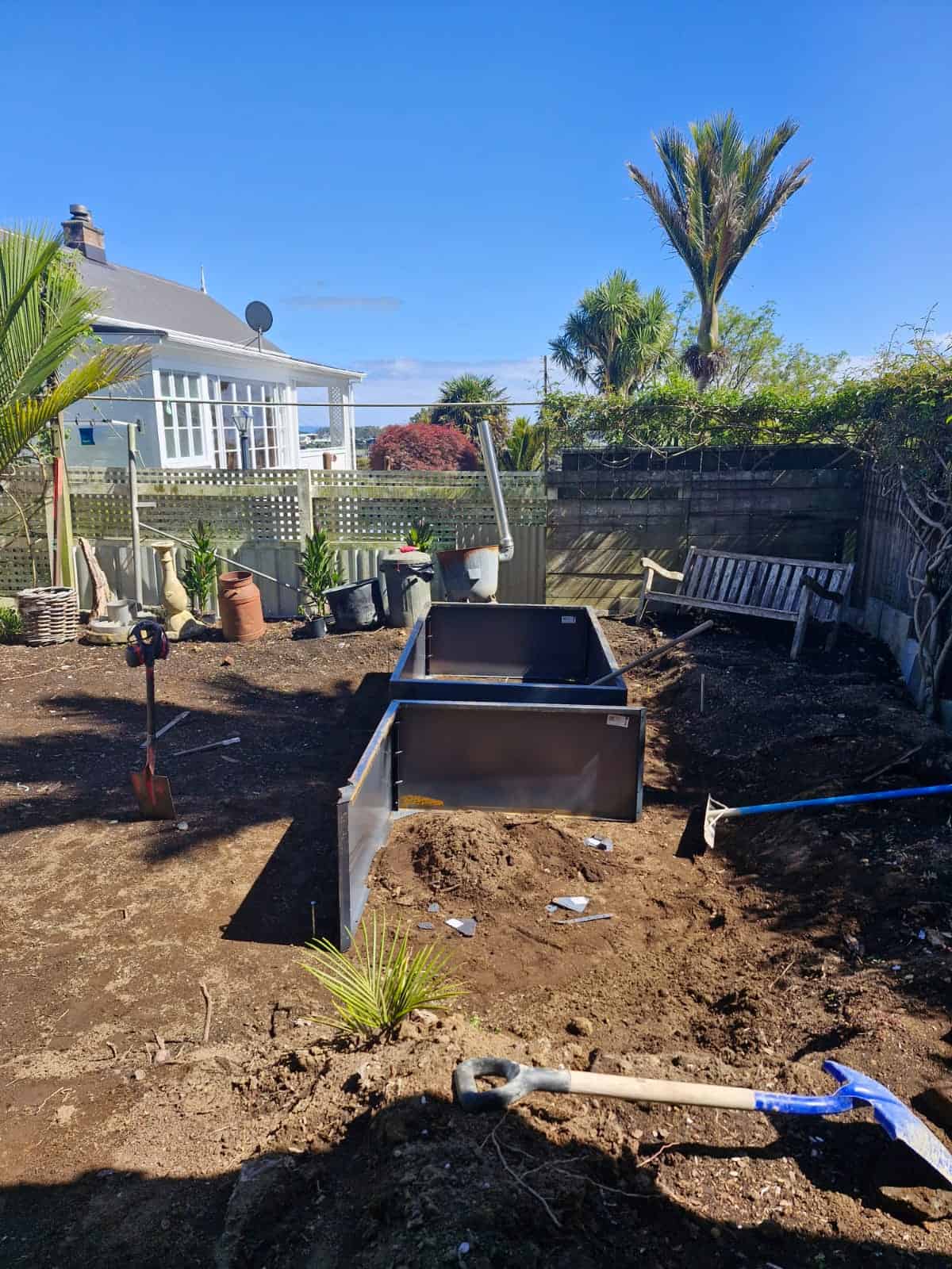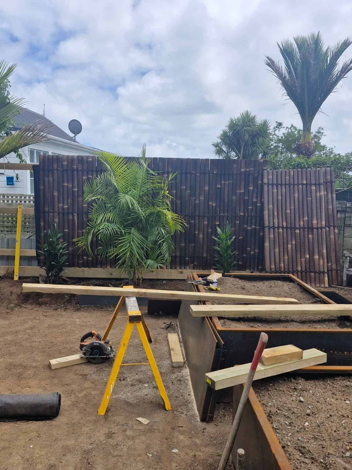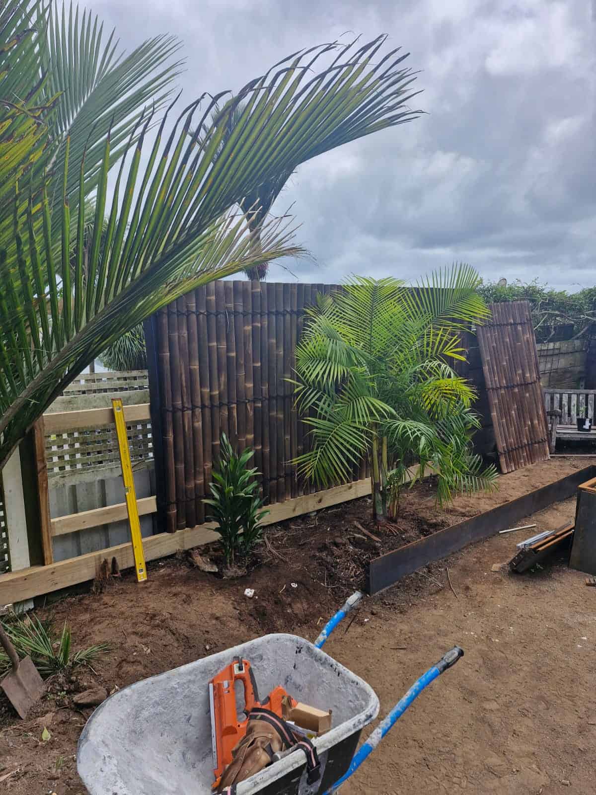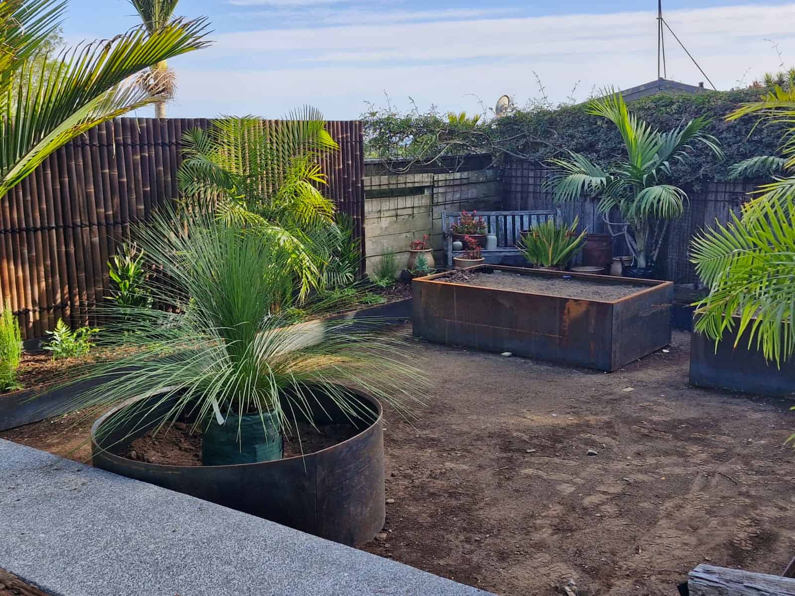 To unify the perimeter, bamboo screening panels were installed to soften and visually simplify the existing fencing. Productive gardening was incorporated through custom raised vegetable boxes constructed along the boundary using Straightcurve garden edging, creating clean architectural lines while maximising planting space. These beds were layered with screening palms and an abundance of ferns to establish privacy and a rich subtropical atmosphere.